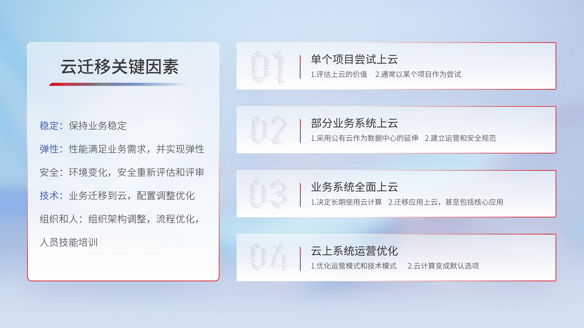 结合实际业务,,,,从规划设计、、云平台选型、、、云原生改造、、数据迁移、、集成交付,,,迁移全过程为客户识别最佳上云路径,,,,做好风险识别管理,,,设计网络架构、、、身份权限、、、、安全审计合规、、、、操作审计、、、、日志审计、、、、监控告警策略、、、、多站点容灾设计等,,,对云上基础设施进行整体规划,,,提升IT治理水平,,,以满足弹性、、、高可用、、高性能的需求。。。。